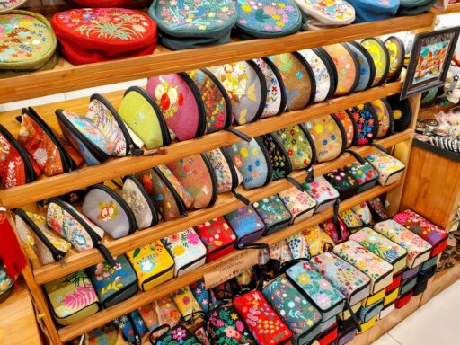 定番の刺繍雑貨、Tシャツなどの衣類などがこの一軒に凝縮。特に刺繍ポーチなどのバラマキ土産を買いたい時に、あちこちのお店をハシゴする手間をかけず、雑貨類を一気にチェックできるのが強みですな。