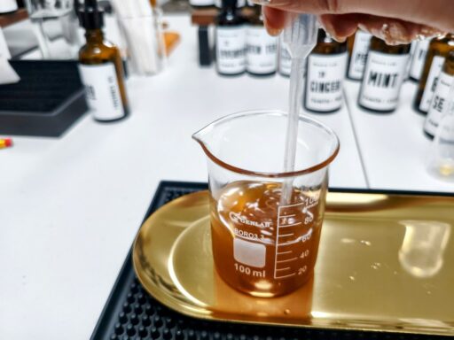 ビーカーやスポイトを使い、少しずつブレンドして香りのバランスを調整する作業は、理科の実験のような楽しさもありつつ、集中できる時間。香りの組み合わせを考えながら調合するうちに、自分だけの香りが少しずつ形になっていくのが楽しい!