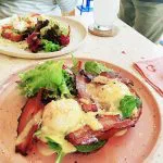 薄めのパンケーキに目玉焼きとベーコンが♪