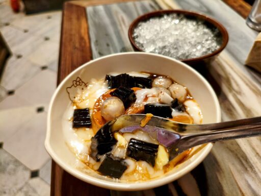 練乳入りの甘く、どこか懐かしい味わいのベトナムプリンのチェー(40,000ドン/約220円)。ベトナムプリンと、周りに散らされた真っ黒な仙草ゼリーのコントラスト。