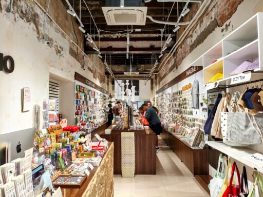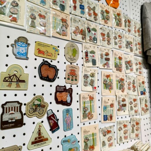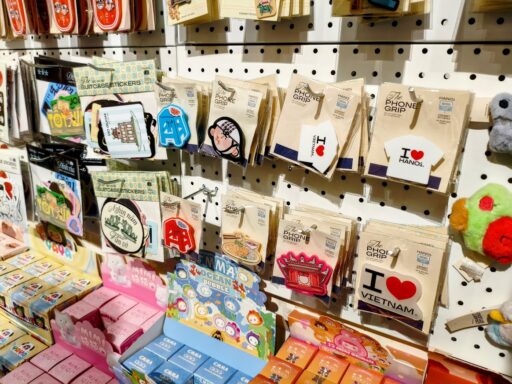 観光客向けにオリジナルデザインのベトナム土産も展開されています。ベトナムの風景や文化をモチーフにしたキーホルダー、マグネット、ステッカーといった小物類が揃っており、どれもこのブランドらしいタッチで描かれていますね。