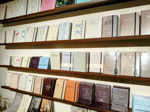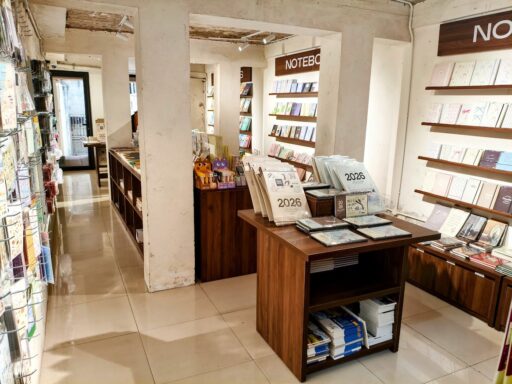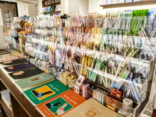 奥にはノートやペン、子供向けの絵本、カレンダーなど文房具が揃っています。
