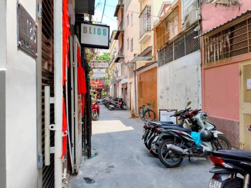 ピンクの教会で有名なホーチミンの観光スポット「タンディン教会」から歩いて10分ほど。他にもナッツやドライフルーツ、お仕立て用の生地も販売している「タンディン市場」も教会のすぐ近くなので、観光や買い物ルートに入れるとよいかと~!