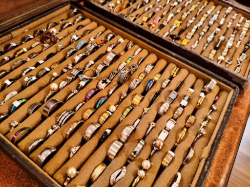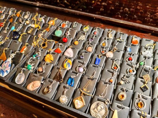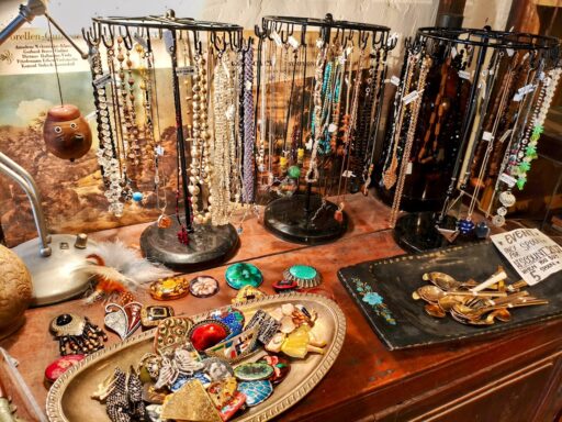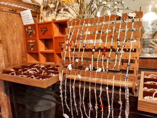 最大の特徴は、個人のショップとは思えないほどのコレクション数です。 指輪で約2000点、ブローチ類:約400点、バングル・ブレスレット:約500点(貝殻、ビーズ、天然石、金属など) 、ネックレスなどなど。