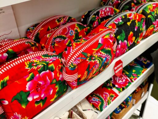 レトロ可愛いと注目される、ベトナム伝統柄「チャンコンコン(Chan Con Cong)」のアイテム。1970〜1980年代の配給時代、牡丹や孔雀の大花柄があしらわれたこの布団生地は、新婚家庭の憧れだった高級品。