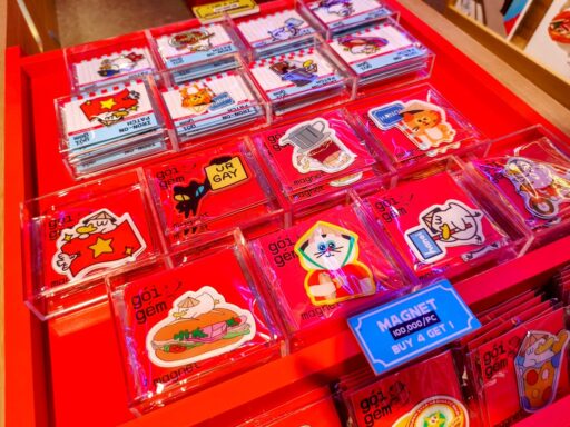 1階は少しTシャツも販売していますが、メインは小物系が多いですね。ポスターやマグネット、シールなどなど。