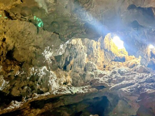 鍾乳洞と神秘的な洞窟体験 ツアーでは、ハロン湾の中でも最大級の広さを誇る「ティンクエン鍾乳洞」を探索。ライトアップされた洞窟内はとても幻想的で、自然が造り出した不思議な造形美に圧倒されました。