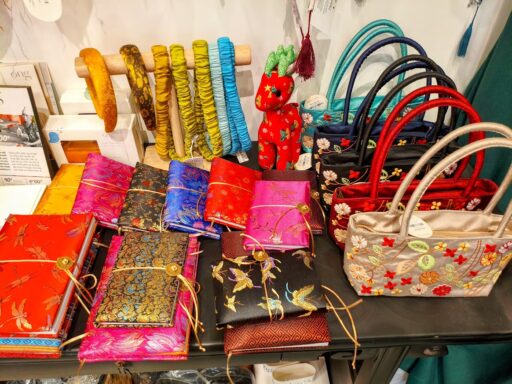 職人の手仕事が光る繊細な刺繍が入ったバッグやポーチは、どこかモダンで日常使いしやすいデザインばかり。ベトナムらしい蓮の花や、愛らしい動物モチーフなど。