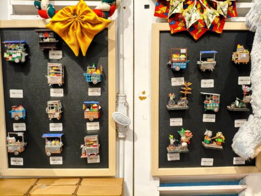 愛らしいマグネットやキーホルダーたち。 特に、ベトナムの日常を再現したミニチュア風のマグネット。
