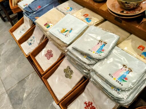ホーチミンの刺繍ブランド「サイゴンチェアー(Saigon Chair)」の刺繍ハンカチも!ホーチミンの直営店は現在毎週土曜日のみ、週に1度だけなこともあり、ハノイ商店で買えるのはありがたいですね~!