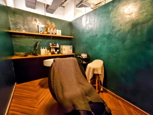 深みのあるグリーンを基調とした壁面が落ち着いた雰囲気を醸し出し、温かみのある木目の床が心地よさを演出。特筆すべきは、こだわりのヘッドスパチェア。