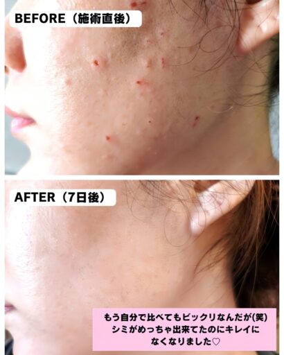 綺麗に確実に反応してくれて、まだシミが取れていない時もワクワクしておりました♡ 7日後と書いてますが、実際には5日後くらいでカサブタもほとんど取れていました。