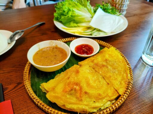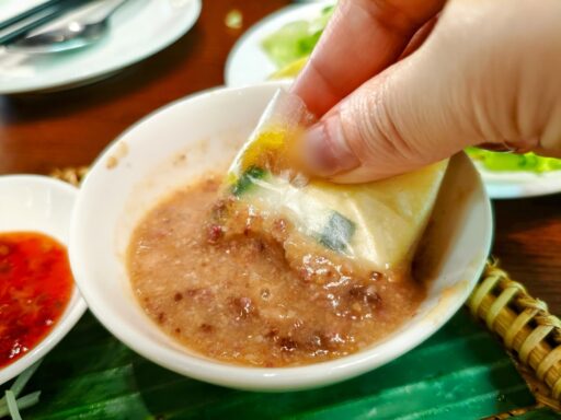 まず小さく切ったバインセオを生野菜やマンゴー、きゅうりなどと一緒にライスペーパーで巻きます。それを少しとろみのあるゴマだれのような特製タレ、またはベトナムの魚醤ヌックマムにつけていただきましょう!