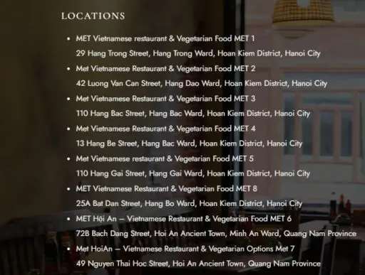 2024年11月時点でベトナム北部ハノイ市に6店舗、中部ホイアンに2店舗展開しています。ハノイでは主に観光エリアに展開しているので、滞在予定のホテルや観光ルートに合わせて支店を選んでくださいね~!
