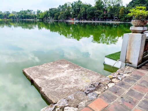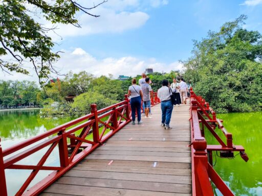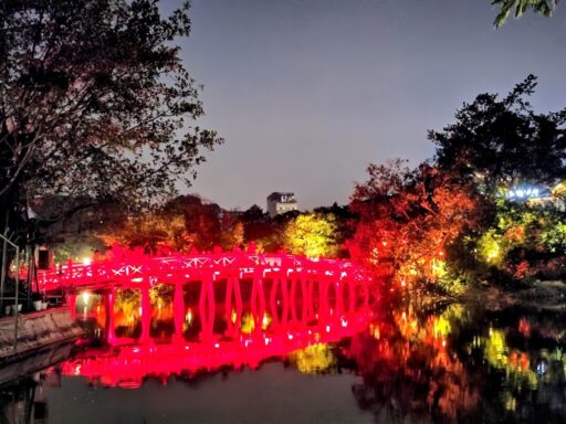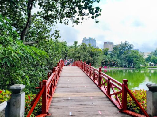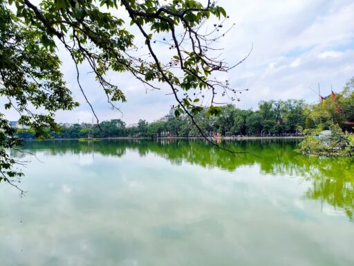 ハノイの象徴ともいえる ホアンキエム湖(Hoàn Kiếm Lake)。 朝はジョギングする地元の人々、昼は観光客で賑わい、夜はライトアップで幻想的な雰囲気に包まれます。