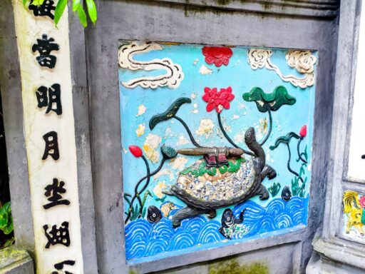 ベトナムでは亀は聖なる動物とされ、穏やかさや安定、そして知識を大切にする精神。刀と書物を乗せている様子は、文と武、知と力の調和を意味し、教的な理想「文武両道」を象徴しているともいわれます。