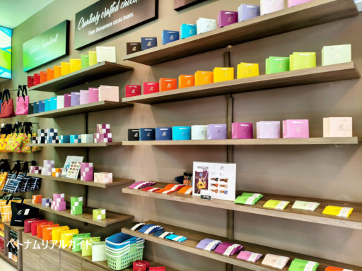 南部ベンチェ省産の高品質なカカオ豆を100%使用。さらに、南国フルーツやフーコック島の黒胡椒など、ベトナム各地の厳選素材を組み合わせることでユニークならがもベトナムらしく、そして美味しいチョコレートとして在住者にも旅行者にも人気!