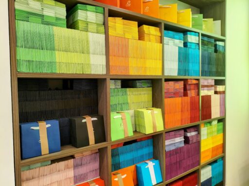 ほど良い広さで潔感のある空間で、フレーバーリストを確認しながら自分のペースでじっくりと選ぶことができます。 ずらりと並ぶ色彩の中から、渡す相手をイメージして箱の色を選ぶ時間も結構楽しいのよ!