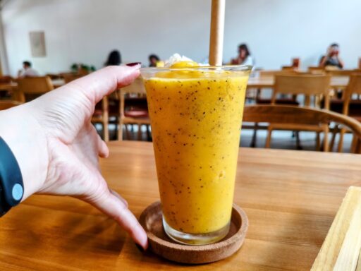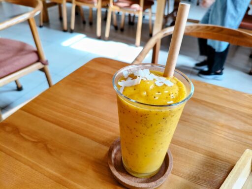 マンゴーのねっとりとしたリッチな質感と、パッションフルーツのプチプチした種の食感が贅沢にミックス。私、結構なんでも飲む量多いのだけど、そんな私でも「全部飲みきれるか...?」と思うくらいの量。