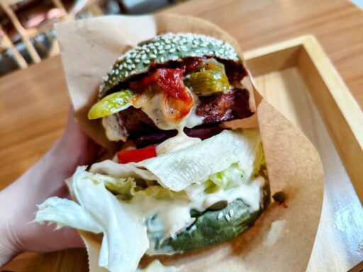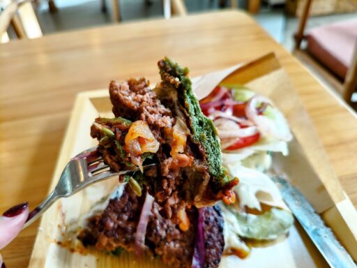 お肉部分は植物由来の原料で作られたらプラントミート。栄養価が非常に高い藍藻類の一種で、スーパーフードとして健康や美容に利用される「スピルリナ」を練り込んだバンズのハンバーガー。
