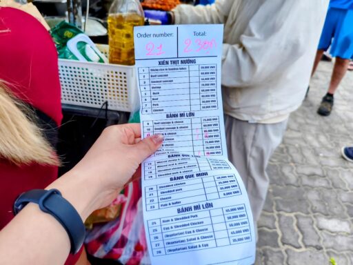 注文の列に並んで自分の順番になったら食べたいバインミーのメニュー番号を伝えましょう。店員さんがチェック&個数を記入していき、そのままココで先払いします。
