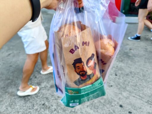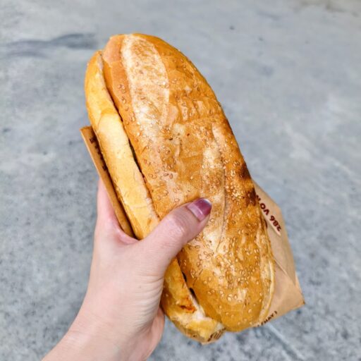 ここのバインミーは、スモールサイズ(Banh Mi Que)かBanh Mi Lon(大きいバインミー)のみ。チーズ入り大きいサイズになるのですが、実際に受け取るとやっぱり大きいね!!
