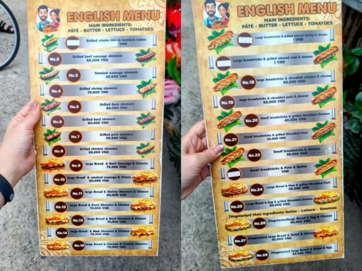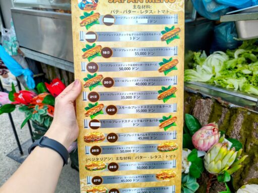 バインミーの価格帯は具材によって変わり、大体50,000~75,000ドン(約300円~450円)とバインミーと考えると少しお高めではあります。