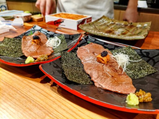 ふふふ、何とも贅沢すぎるお寿司だわ。目の前で軽く炙られたA5ランクの和牛に、濃厚な雲丹と塩気と風味がアクセントになるキャビアが添えられています。