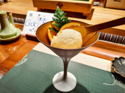 本格的な江戸前鮨のコースを堪能し、贅沢な余韻に浸っていると、最後のデザートに「柚子シャーベット」。上品な柚子の香りと、キリッと冷たいシャーベットの爽やかな酸味が口の中をすっきりとリフレッシュしてくれます。