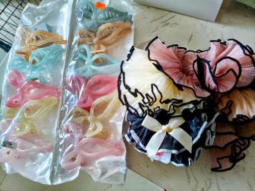 お友達は知り合いのお子様たちへのプレゼント用にリボンバナナクリップ(12個入りで150,000ドン)。右は娘用に購入したレースシュシュ(10個入り、確か100,000ドンぐらいだったはず)。