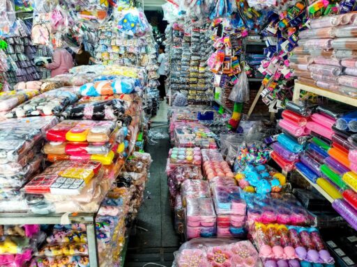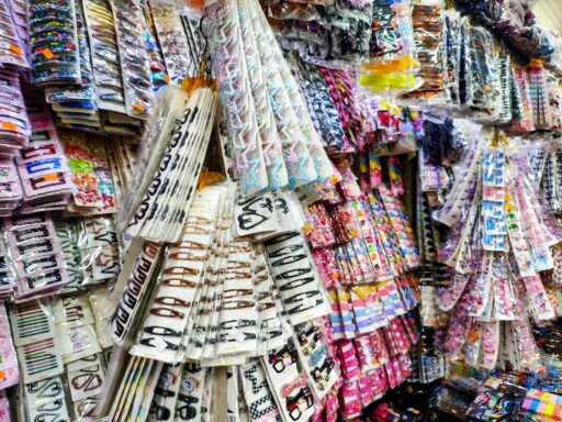 通路は人一人がようやく通れるかというほどの狭さですが、その両脇にはカラフルな商品が山積みになっています。商品の陳列は雑多に見えますが、探しているものが見つかるよう、色や種類ごとに大まかに分けられています。