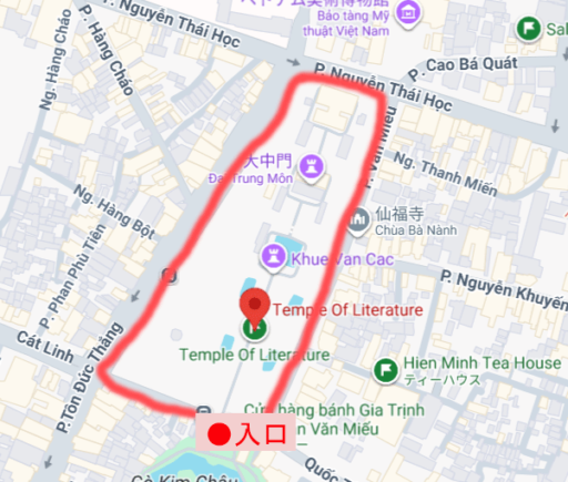 ただし、入口はQuoc Tu Giam(クオックトゥザム)通りにあるので、赤色の「●入口」に向かっていきましょう~!