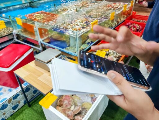 生簀のシーフードは時価のものが多いので、注文前に必ず価格を確認しましょう。スマホの電卓画面を差し出せば、その時の金額を打ち込んでくれます。