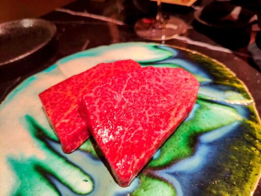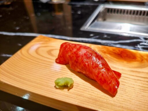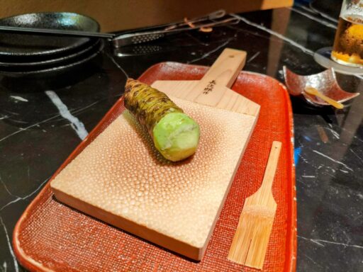 目の前で丁寧にすりおろされたわさびは、フレッシュな香りと爽やかな辛味が特徴。このわさびを少し乗せていただくことで、和牛の脂の甘みが引き締まり、さらに奥深い味わいへと変化。