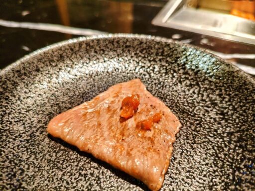 サンカクは、見た目にも美しいサシ(霜降り)が入った部位です。軽く炙って口に運ぶと、濃厚な肉の旨みがじゅわっと広がり、同時にとろけるような柔らかな食感に驚きよ♡